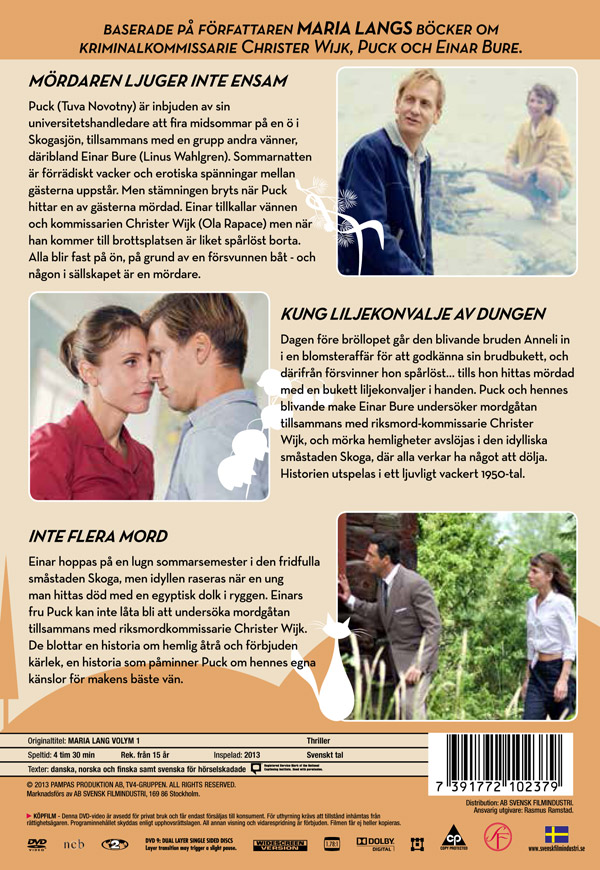MÖRDAREN LJUGER INTE ENSAM Puck (Tuva Novotny) är inbjuden av sin universitetshandledare att fira midsommar på en ö i Skogasjön, tillsammans med en grupp andra vänner, däribland Einar Bure (Linus Wahlgren). Sommarnatten är förrädiskt vacker och erotiska spänningar mellan gästerna uppstår. Men stämningen bryts när Puck hittar en av gästerna mördad. Einar tillkallar vännen och kommissarien Christer Wijk (Ola Rapace) men när han kommer till brottsplatsen är liket spårlöst borta. Alla blir fast på ön, på grund av en försvunnen båt - och någon i sällskapet är en mördare. KUNG LILJEKONVALJE AV DUNGEN är baserad på Maria Langs bok om kriminalkommissarie Christer Wijk, Puck och Eje Bure. Dagen före bröllopet går den blivande bruden Anneli in i en blomsteraffär för att godkänna sin brudbukett, och därifrån försvinner hon spårlöst… tills hon hittas mördad med en bukett liljekonvaljer i handen. Puck (Tuva Novotny) och hennes blivande make Eje Bure (Linus Wahlgren) undersöker mordgåtan tillsammans med riksmord-kommissarie Christer Wijk (Ola Rapace), och mörka hemligheter avslöjas i den idylliska småstaden Skoga, där alla verkar ha något att dölja. Historien utspelas i ett ljuvligt vackert 1950-tal. INTE FLERA MORD är baserad på författaren MARIA LANGS bok om kriminalkommissarie Christer Wijk, Puck och Einar Bure. Einar (Linus Wahlgren) hoppas på en lugn sommarsemester i den fridfulla småstaden Skoga, men idyllen raseras när en ung man hittas död med en egyptisk dolk i ryggen. Einars fru Puck (Tuva Novotny) kan inte låta bli att undersöka mordgåtan tillsammans med riksmordkommissarie Christer Wijk (Ola Rapace). De blottar en historia om hemlig åtrå och förbjuden kärlek, en historia som påminner Puck om hennes egna känslor för makens bäste vän.