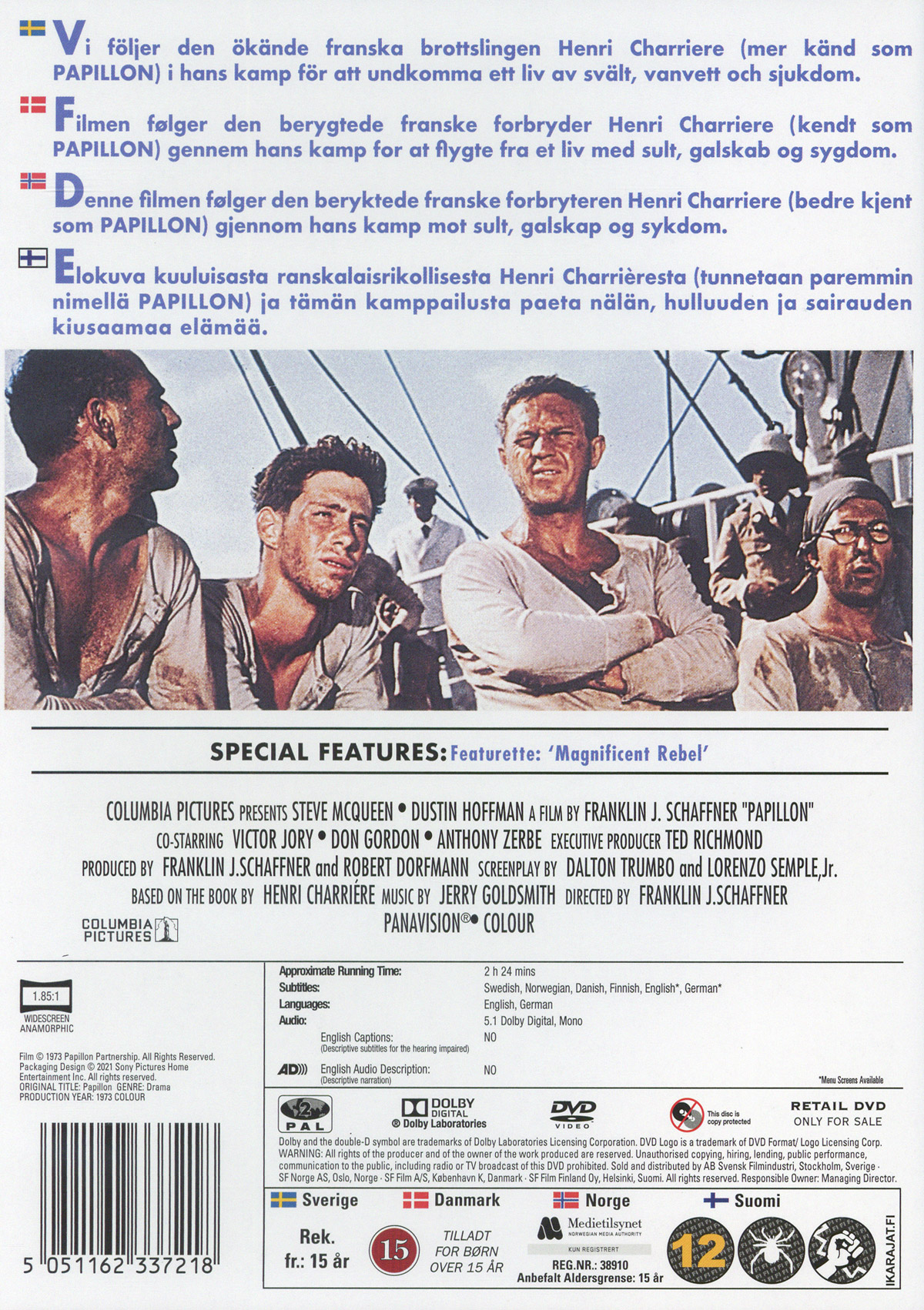 Dom kallade honom för Papillon, Fjärilen. Om han bara hade fått vingar också. Oförmögen att flyga fick Henri Charriere använda bara sin vilja för att kunna bli fri. Han fortsatte, ända tills han gjorde det omöjliga: att fly från Djävulsön. Baserad på Charrieres bästsäljande roman, filmad i Spanien och på Jamaica, är Franklin J Schaffners mästerverk en höjdpunkt i två stora skådespelares karriärer. Efter strålande insatser i The Great Escape, The Sand Pebbles och Bullitt, fick Steve McQueen här sin drömroll. Dustin Hoffmann hade filmer som The Graduate, Midnight Cowboy och Little Big Man och fick här strålande kritik för sin roll som Dega, Charriere´s ruffiga kamrat.