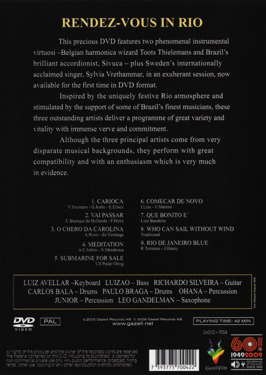 This DVD features two phenomenal instrumental virtuosos - Belgian harmonica wizard Toots Thieleman and Brazil's brilliant accordion player Sivuca - plus Sweden's internationally acclaimed singer, Sylvia Vrethammar, in an exuberant session, beautifully filmed in the uniquely festive atmosphere of Rio de Janeiro supported by some of Brazil's finest musicians incl: Luiz Avellar, Luizao, Carlos Bala and Paulo Braga.